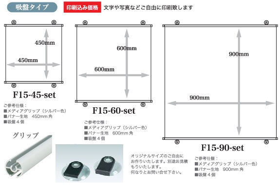■グリップ アルミ押出 アルマイト仕上 シルバー色 ■面 バナークロス印刷仕上 ■吸盤 4個