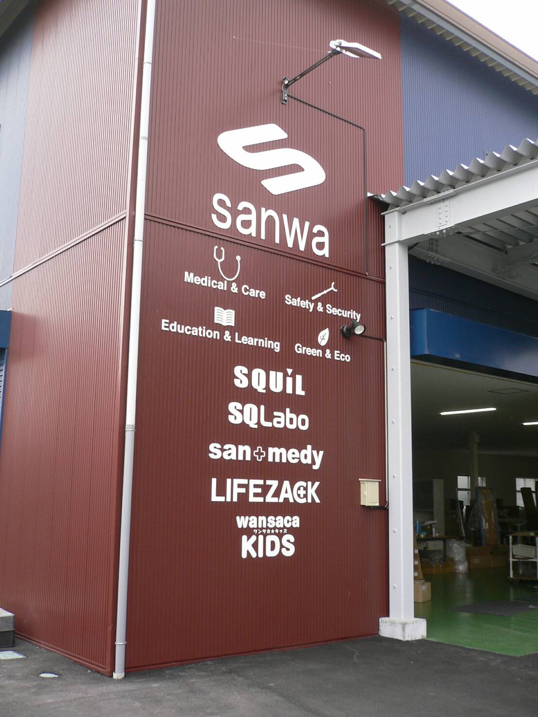 倉庫の壁に アクリル切文字とスポットライトを取付いたしました。アクリル切文字は厚みがあるので 高級感が出ます。